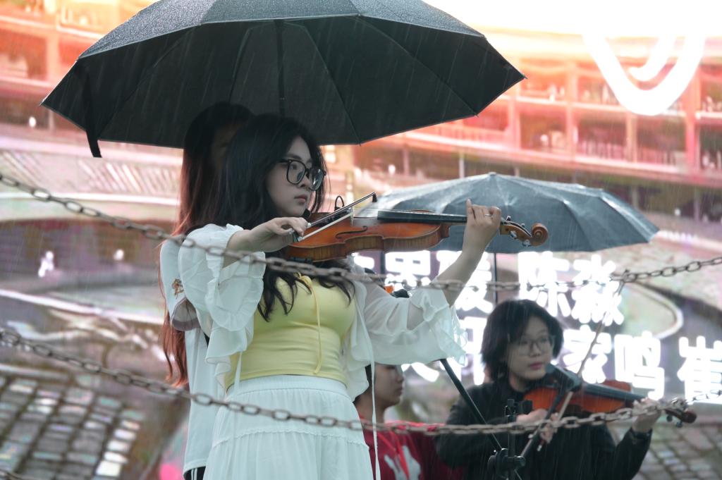 第二篇章“星光引航•感恩同行”在悠扬的乐器合奏《大鱼》中精彩开篇。笛子的清亮与小提琴的婉转完美交融,古典韵律与现代乐感激情碰撞,跳跃的音符编织成美妙旋律,带领观众沉浸于艺术的海洋,感受音乐的独特魅力;歌曲串烧《What Are Words》《寂静森林》《我们的明天》《海阔天空》依次唱响,熟悉的旋律引发全场大合唱。歌声中,图书馆苦读的凌晨、排练室挥洒的汗水、跑道上追赶的晨曦等校园记忆,都化作夏夜晚风里的闪耀碎片。