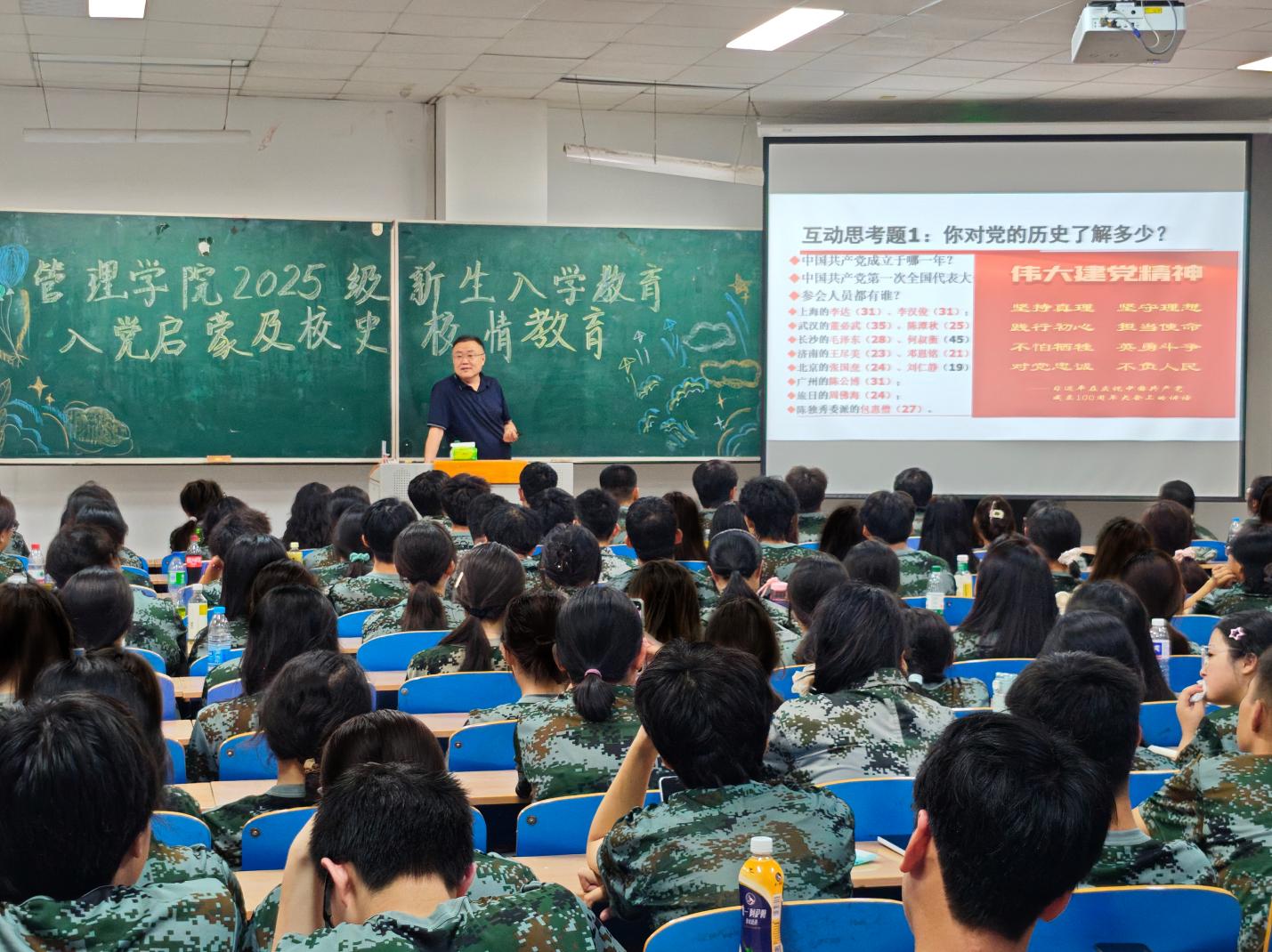 为深入学习贯彻习近平新时代中国特色社会主义思想,全面落实《OD在线2025级学生入学教育方案》,引导新生厚植信仰根基、校准政治方向,9月2日,管理学院党委书记何景洋先后走进主楼WN0201、WS0304教室,围绕“争做党的好儿女”主题,以校史校情为切入点,为2025级全体新生讲授入党启蒙教育第一课。
