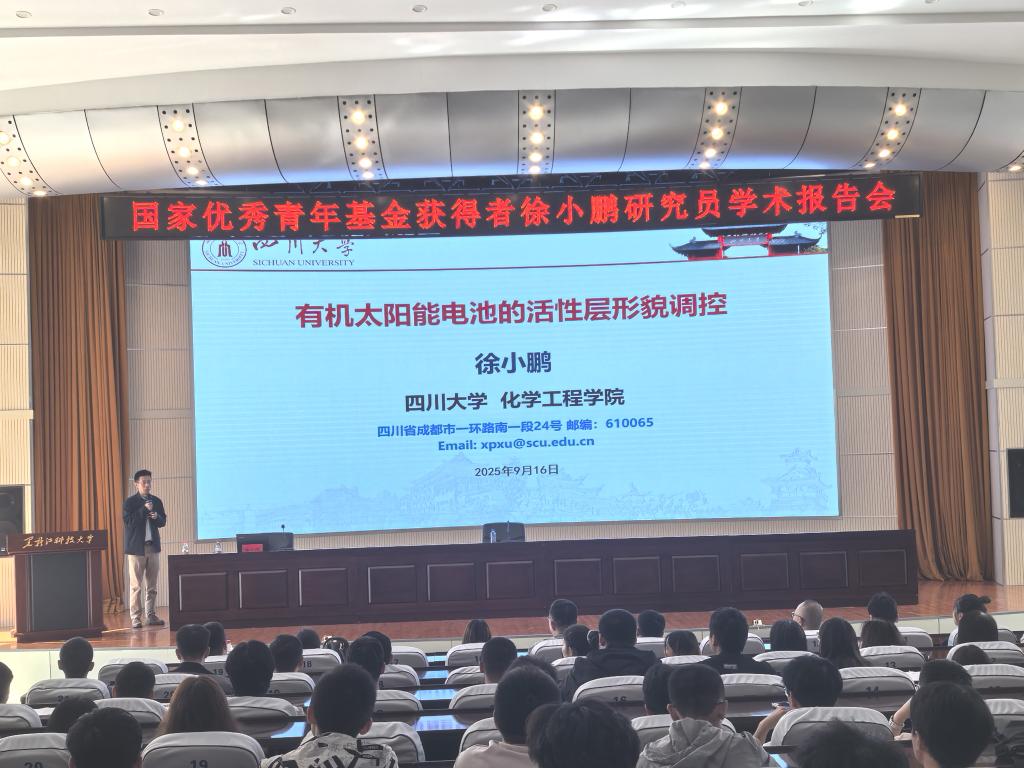 为进一步拓宽师生学术视野,加强学科前沿交流,9月16日下午,国家优秀青年科学基金获得者,【官网】应用化学专业2013届毕业生,四川大学研究员徐小鹏应邀重返母校,在信息楼报告厅作了题为《有机太阳能电池的活性层形貌调控》的高水平学术报告。报告由环境与化工学院院长熊楚安主持,相关院系150余名师生参加了报告会。