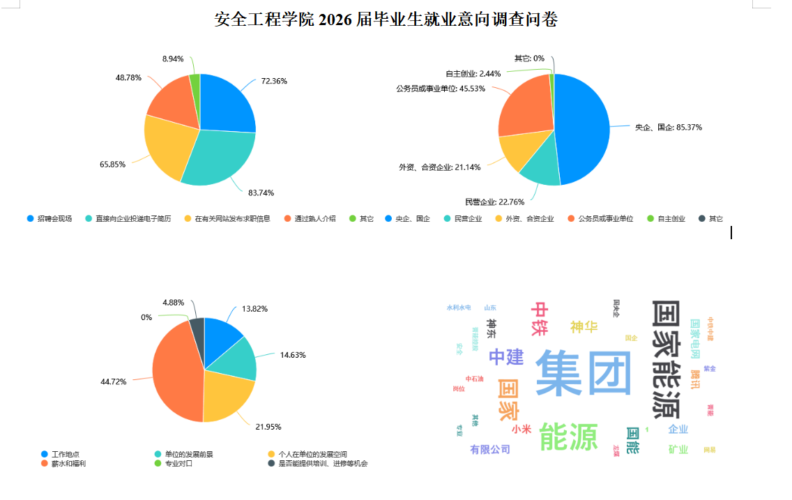 摸清需求建台账,精准勾勒“就业图”。安全工程学院以就业意向问卷调查为基础,从就业方向、期望岗位、薪资诉求、求职难点等维度全面摸排,掌握毕业生基础需求;安全工程学院建立实时就业动态台账,对毕业生求职进展、签约情况、待解决问题等信息每周一更新,确保每一名学生的就业状态“底数清、情况明”;依据问卷数据与台账信息双向联动,为定制化就业服务提供精准依据。