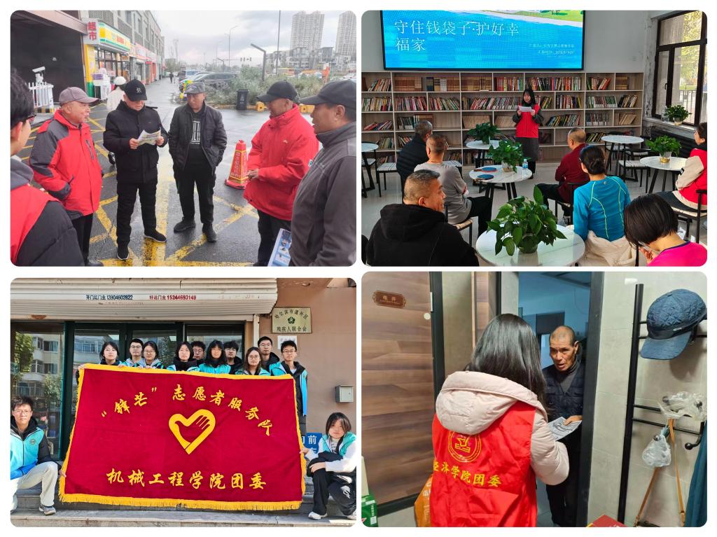 安全学院团委开展“守住钱袋子、护好幸福家”防诈宣传活动,帮助10余位老人安装国家反诈中心APP;机械学院团委前往道外区残疾人综合服务中心,手把手教老人如何识别诈骗风险、开启防护模式;经济学院团委、理学院团委分别前往华美天樾社区、保利广信社区,结合典型案例,用通俗易懂的语言向社区老人讲解电信诈骗等常见骗局的识别方法与应对技巧,向老年人普及相关法律知识,助力其防范风险、依法维权,营造良好社会氛围。