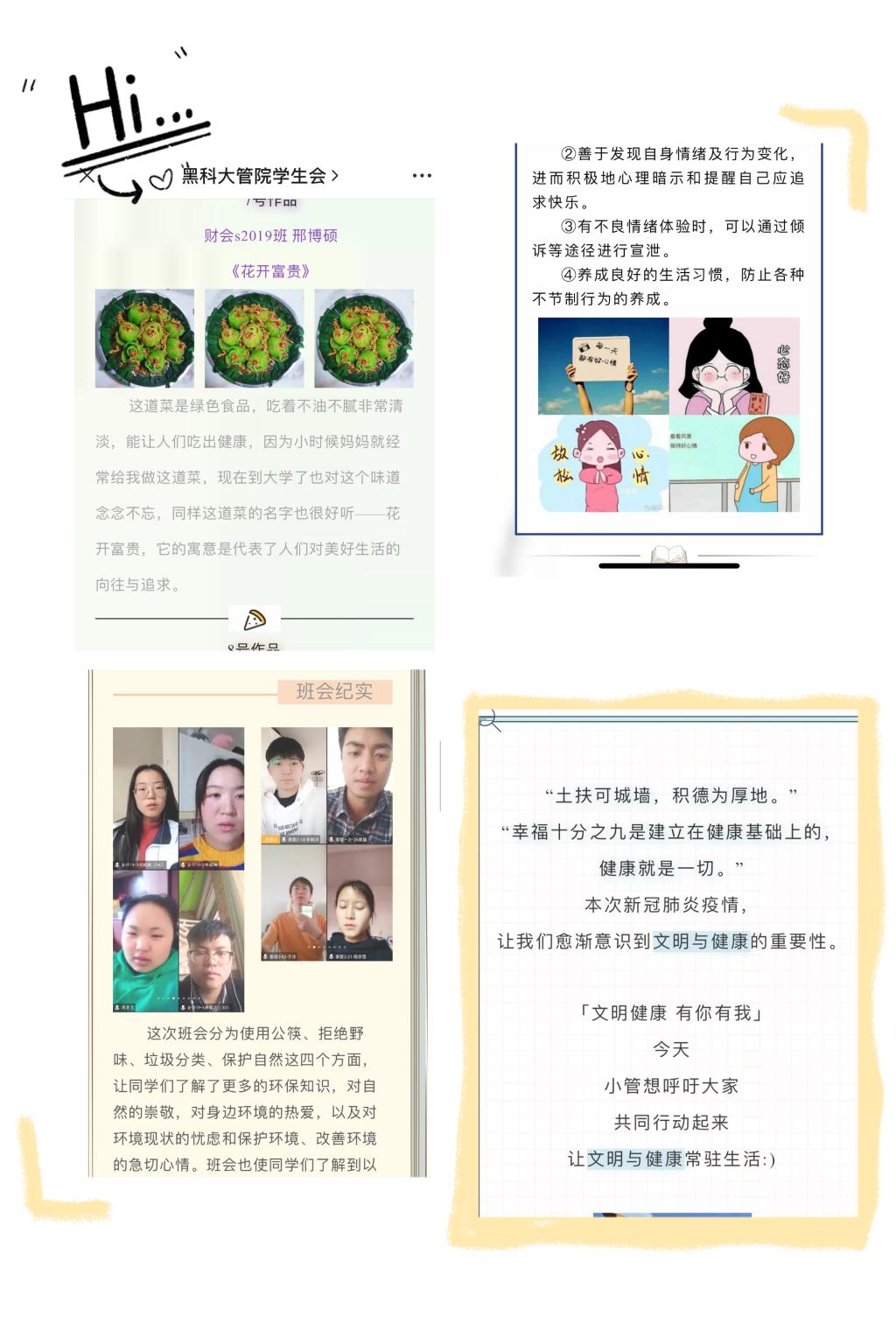 利用“黑OD在线管院学生会”线上平台举办“晒一晒你家乡特色美食”大赛,紧扣绿色环保主题,鼓励管院全体学生“知行合一”,“内外”兼修,亲自烹制并分享地方特色美食,展示家乡独特魅力,在潜移默化中引导学生,将简约纯粹、绿色健康的生活理念根植于心,牢牢把握文明健康接力棒。通过组织全院学生召开“环境卫生,从身边做起”线上公益主题班会活动,有效增强学生饮食卫生安全意识,培养良好生活习惯。从使用公筷、拒绝野味、垃圾分类、保护自然四方面展开引导学生展开充分讨论和思考,指引学生深入了解相关环保知识,理解尊重自然、顺应自然、保护自然之必要,敬畏自然之必然。