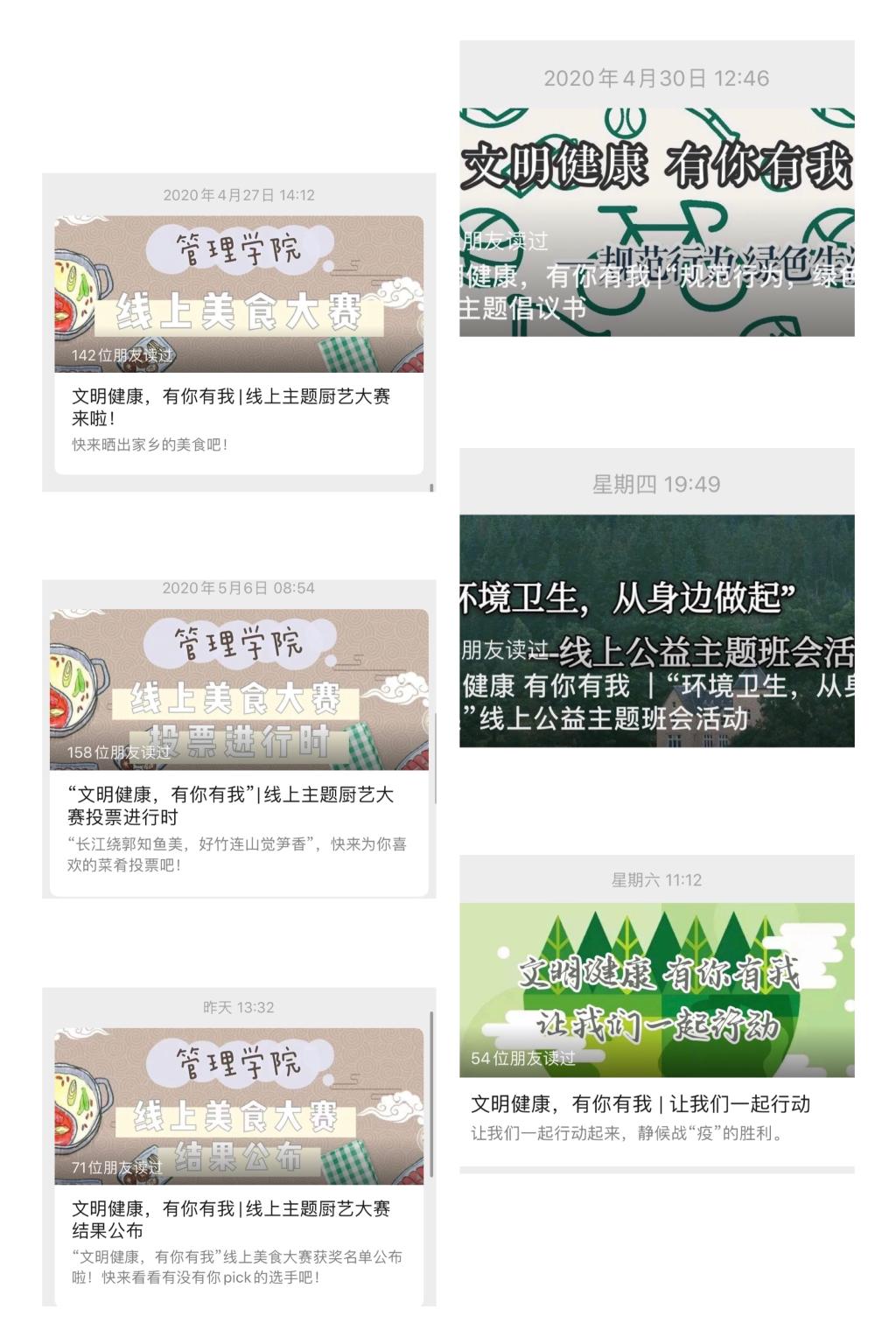 本次系列活动的顺利开展,在深入贯彻绿色环保理念的同时充分夯实了管院学生文明健康教育工作的基石,带动管院学生提升自身修养,加强理论学习,将文明健康、绿色环保的意识自觉牢固于心,外化于行。生逢其时,重任在肩,此次活动为管院全体学生助力抗“疫”取得最后胜利打下思想强心剂的同时更加坚定了管院学子以爱国、励志、求真、力行书写青春之歌的豪迈信念!