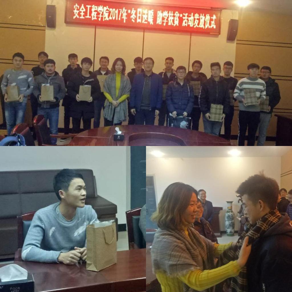 特困生群体的学习和成长一直是安全工程学院非常关注的工作。为了更好的激发贫困学生的成长动力和信心,帮助他们树立正确的心态,引导他们“人生路,感恩走”,以积极、阳光、健康的生活方式度过大学生活,学院于11月28日下午15时在会议室召开了特困学生“冬日送暖、助学扶贫”活动。安全工程学院党委书记王英哲参加了此次会议。会议由安全学院学工办主任杨凤娟主持。