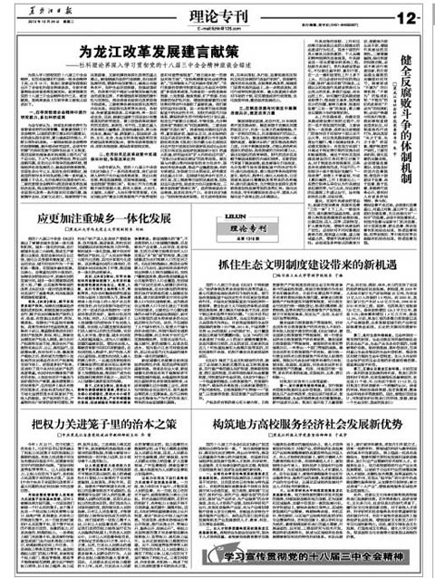 12月10日,黑龙江省委宣传部组织召开了全省社科理论界深入学习贯彻党的十八届三中全会精神座谈会。专家学者紧密结合我省改革发展实际,就贯彻落实党的十八届三中全会精神各抒己见、建言献策。【官网】党委常委、宣传部(统战部)部长于成学参加了座谈会,并以《构筑地方高校服务经济社会发展新优势》为题作了发言,12月24日《黑龙江日报》予以全文刊发。现将全文转发,以便学习交流。