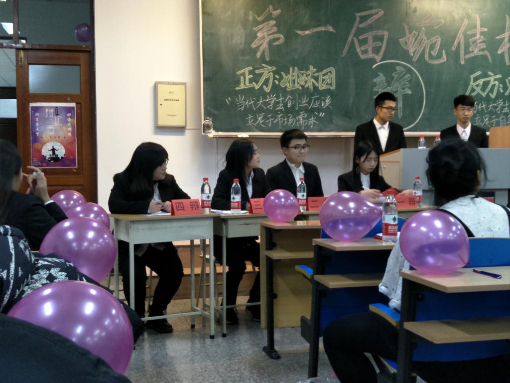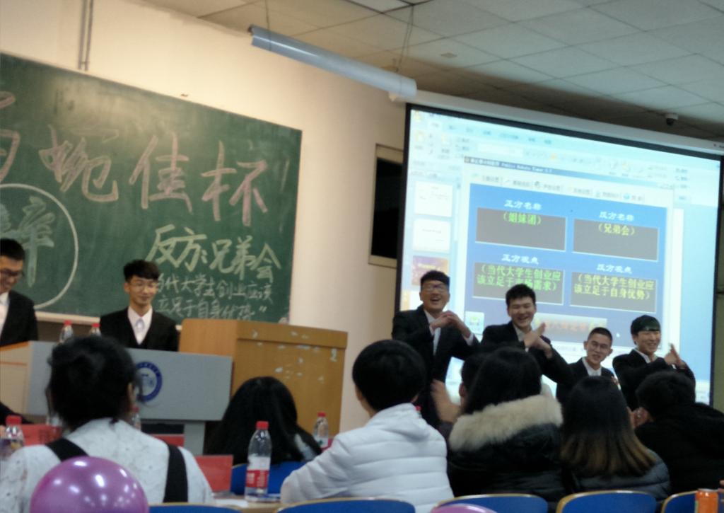 本次辩论赛的辩手是由学生分会外联部的男、女同学分别担任的,男生组成了“兄弟会”代表队,女生组成了“姐妹团”代表队。双方就“当代大学生创业应该立足于市场需求还是应该立足于自身优势”展开了激烈的辩论。