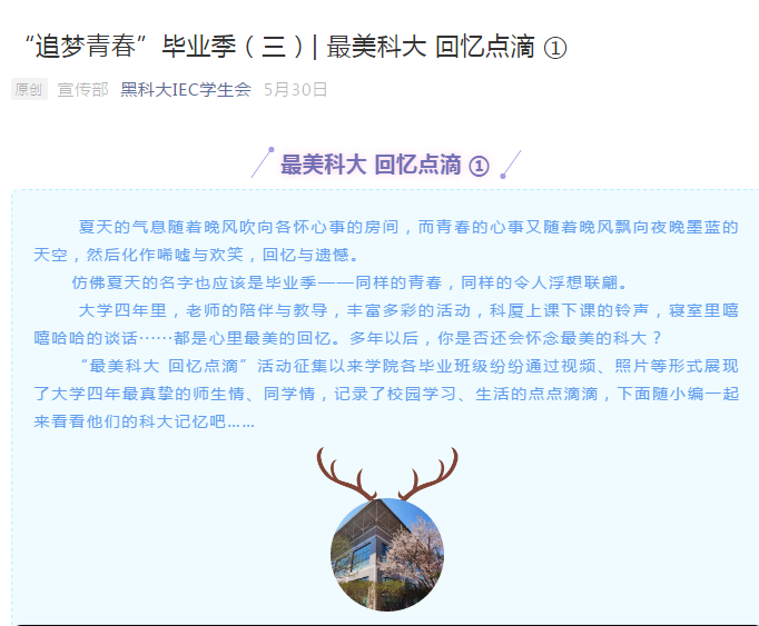 毕业班级借助微视频回忆青春,寄语母校,展现了大学四年最真挚的师生情、同学情,记录下大学四年校园时代的种种畅想和点滴怀念,充分展示了2020届毕业生奋斗的青春故事和大学时光的难忘回忆,传递感动、传播正能量,激励毕业生以青春之我、奋斗之我开启人生新篇章。