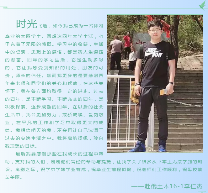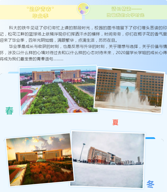 大学四年留下太多的点点滴滴,在母校留下自己的青春记忆,收获快乐,收获成长,毕业生们通过分享感悟大学四年学习、生活的成长经验与收获,对学校为自己提供的成长平台表示感谢,表达了自己对学院和老师的不舍之情以及对学弟学妹们的祝福。