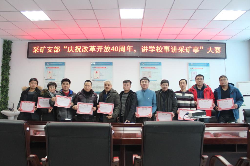 12月29日上午,矿业工程学院采矿系教师党支部举办“庆祝改革开放40周年,讲学校事讲采矿事”大赛,矿业工程学院副院长康健,采矿专业党支部书记陈海波以及采矿专业的所有在校教师参加了活动。