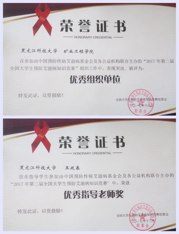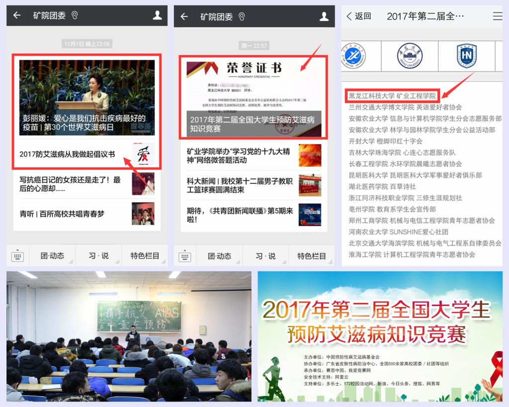 12月31日,由中国预防性病艾滋病基金会主办、多家单位承办的“2017年第二届全国大学生预防艾滋病知识竞赛”落下帷幕。【官网】矿业学院作为全国500余家高校团委/社团等组织之一积极承办了本次活动。参赛期间,矿业学院积极筹备、扎实推进,共组织300人参赛,由于表现突出,学院荣获“优秀组织单位”荣誉称号,辅导员王延春荣获“优秀指导教师奖”,宋雨薇等同学荣获“优秀志愿者”荣誉称号。