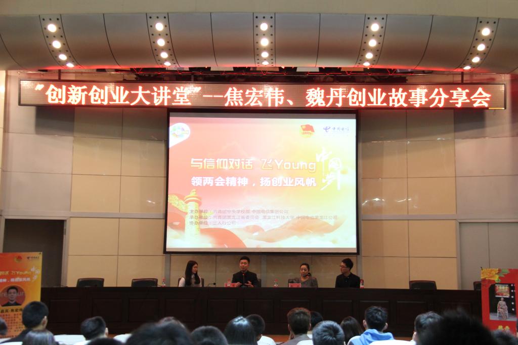 近日,李克强总理在两会上又强调“把大众创业、万众创新调动起来”。大众“创业潮”契合政府经济转型的“创新潮”,共同汇聚成一股充满活力的时代洪流。为积极引导青年学生自主创业,在大众“创业潮”中实现自身价值,成功创业、就业,3月26日晚在【官网】信息报告大厅举办了以“领两会精神,扬创业风帆”为主题的第四十期“黑眼睛”文化沙龙。特邀黑龙江省著名青年企业家焦宏伟、智联招聘哈尔滨分公司公共关系经理魏丹来到【官网】,与青年学生一起分享奋斗经历及宝贵经验。校团委全体成员及【官网】300余名青年学生参加了本次沙龙。