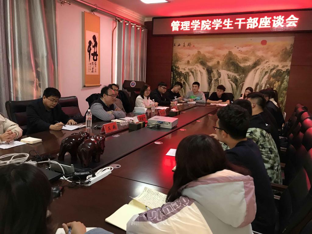 11月13日下午,管理学院在学院三楼会议室召开了学生干部座谈会。管理学院党委副书记徐健一、学工办主任孙亚鹏、团委书记左巍、学生分会指导教师张茜与第七届管理学院学生分会主席团及部长级以上干部参加了本次座谈会。