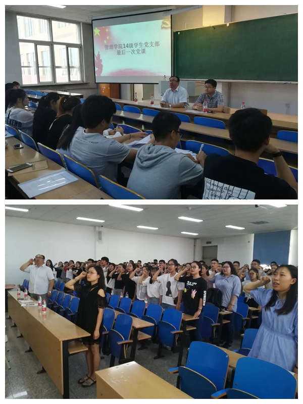 为深入贯彻习近平新时代中国特色社会主义思想,使毕业生党员坚定理想信念,切实肩负起实现中华民族伟大复兴的历史使命,矢志不渝地发挥党员先锋模范作用,为中国梦的实现贡献一份力量,管理学院党委副书记徐健一、2014级学生党支部书记左巍于6月14日为2014级毕业生党员上了最后一次党课。