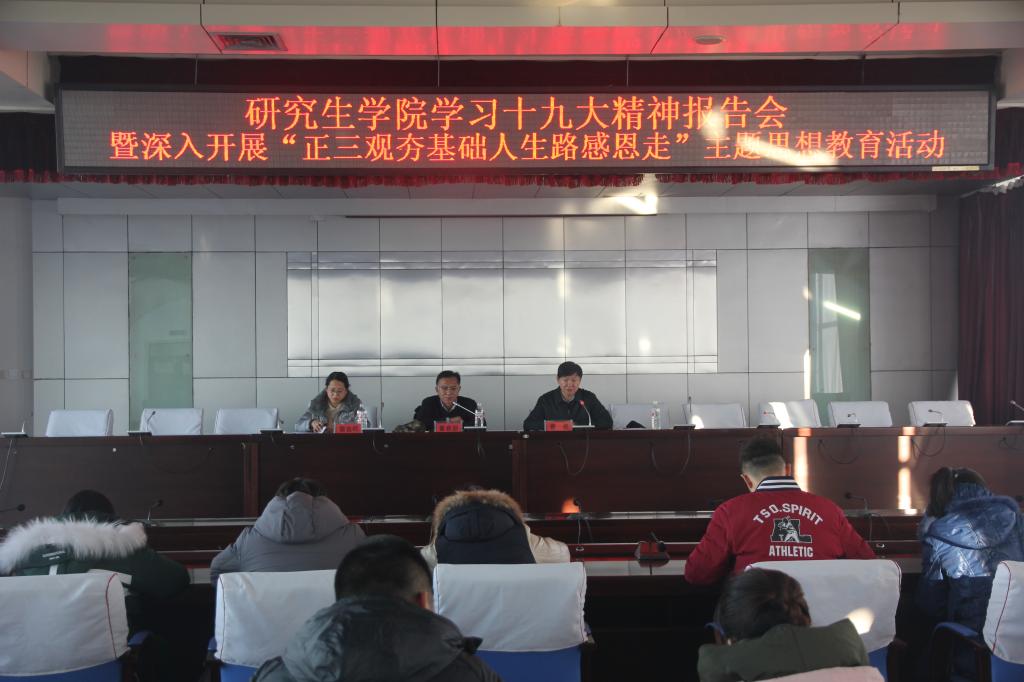为深入学习宣传贯彻党的十九大精神,深入推进“正三观、夯基础、人生路、感恩走”主题思想教育。11月30日,研究生学院在办公楼6004举办了学习十九大精神报告会暨深入开展“正三观、夯基础、人生路、感恩走”主题思想教育活动。研一全体党员、入党积极分子和老生党员代表参加会议。会议由院党委书记董春游主持。