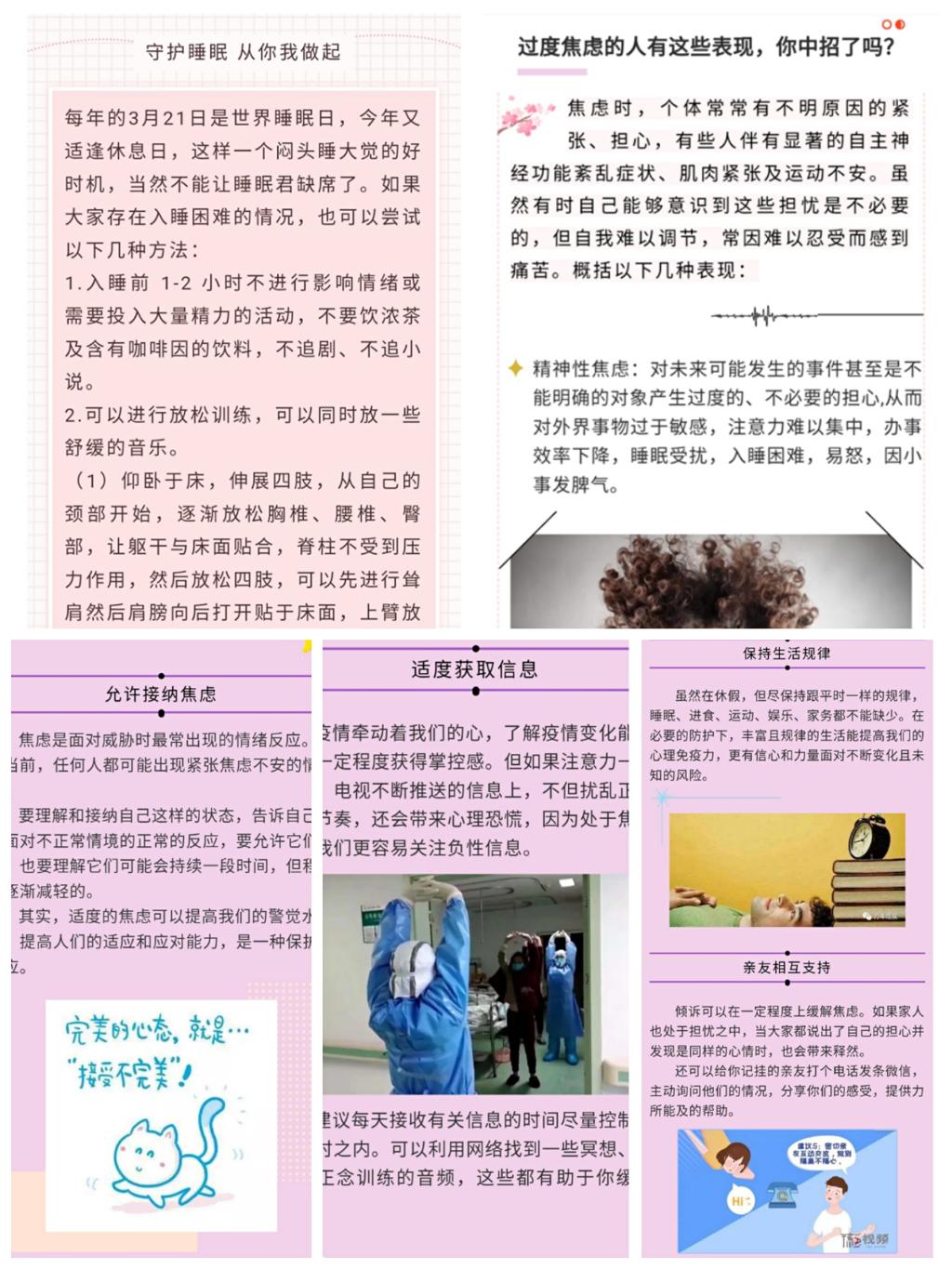 一、心理“疫”站,普及常识。新冠肺炎疫情发生后,部分学生出现压力过大、焦虑、烦躁等情绪,心理健康不容忽视。为了使大家正确认识和科学应对新冠肺炎疫情,在疫情防控中拥有健康心理,学院对常见的心理问题进行整理和分析,并在公众号上进行推送,旨在帮助学生梳理疫情期间出现的各种心理问题和心理反应,介绍心理应激的相关常识,帮助学生降低恐慌、紧张、焦虑、抑郁等负面情绪,提升和调整自身心理状态的能力,从而建立积极、良好、健康的心态,更好地迎接美好生活。