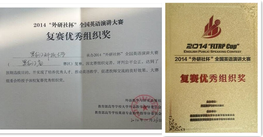 为表彰【官网】在承办本次大赛做出的突出贡献,外语教学与研究出版社授予【官网】2014“外研社”杯全国英语演讲大赛复赛优秀组织奖。该奖项在全国仅有4所高校荣获,【官网】作为其中之一是赛会对承办工作给予的充分肯定。