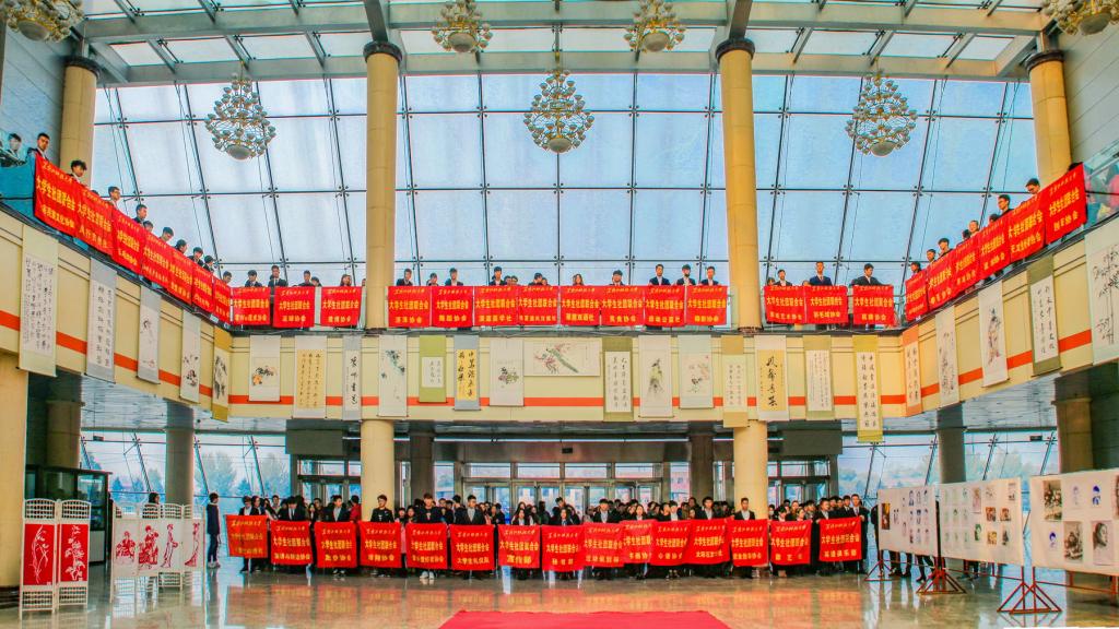 【官网】“不忘初心跟党走、青春喜迎十九大”2017年社团巡礼月启动仪式暨第三届金秋书画展于10月20日中午在阳光大厅举行。校党委副书记张明华、校团委全体教师以及大学生社团联合会600余名学生代表参加了启动仪式。仪式由大学生社团联合会主席王东旭主持。