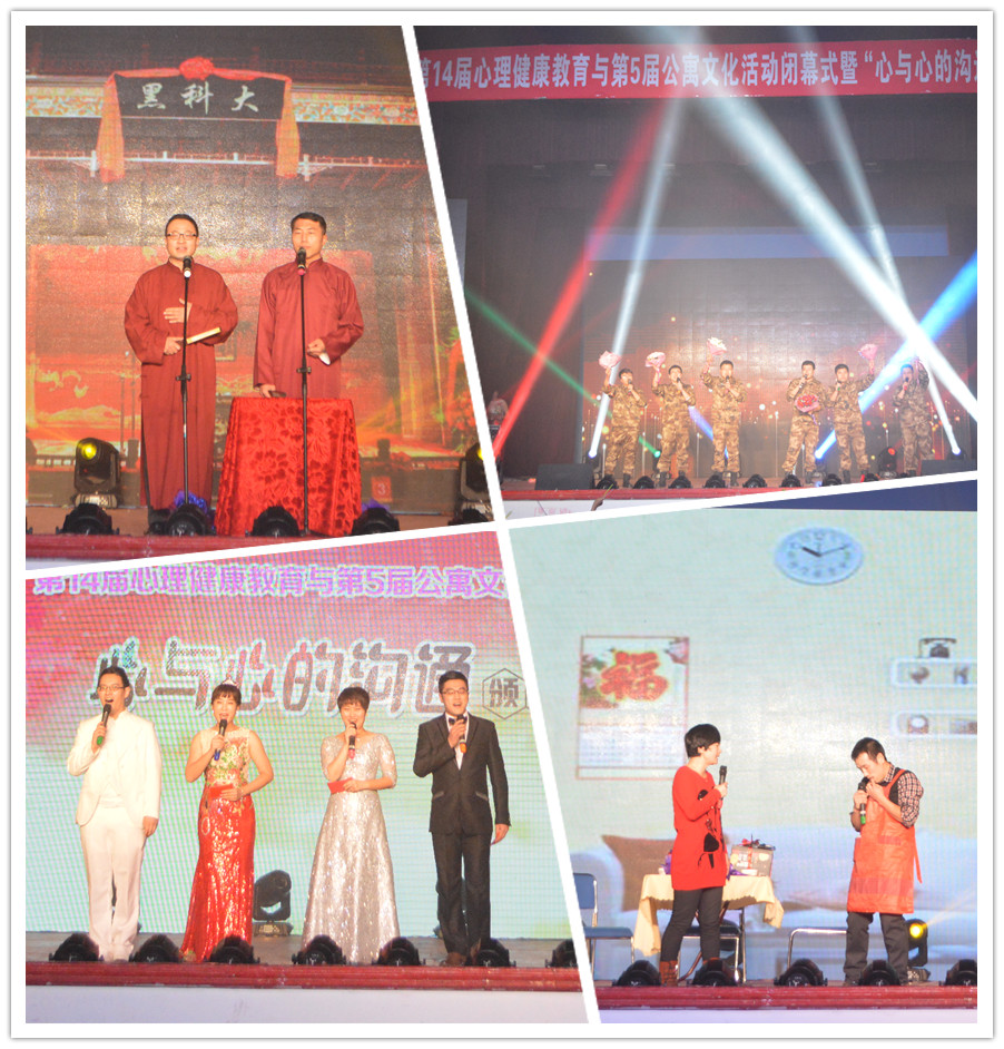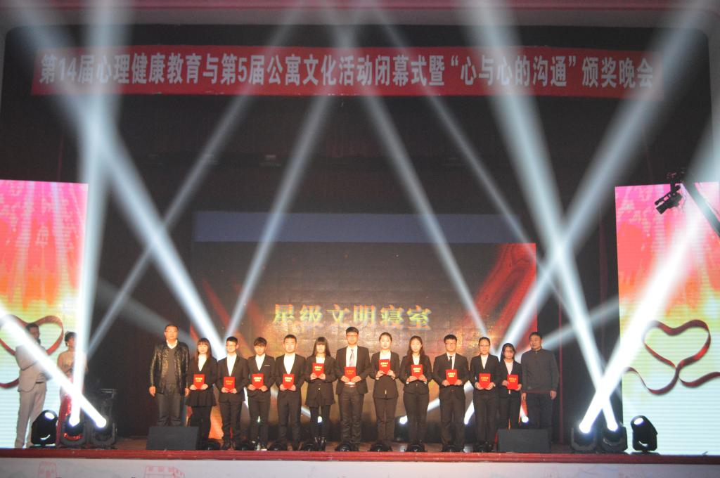 闭幕式及颁奖晚会在别具特色的开场舞《心花怒放》中拉开了序幕,大会表彰了在第十四届大学生心理健康活动月和第五届公寓文化节当中表现突出的单位和个人。管理学院的校园心理剧、国教学院的心理涂鸦创意大赛、经济学院的心海拾贝、理学院的心理沙盘作品创作大赛、外国语学院的趣味三国心理争霸赛荣获2016年心理健康教育优秀活动奖;矿业学院,环化学院,安全学院,国教学院荣获2016年星级文明寝室创建先进单位;大会还对2016年“十佳”心理委员、“十佳”服务育人之星、优秀心灵使者以及星级文明寝室进行了表彰。