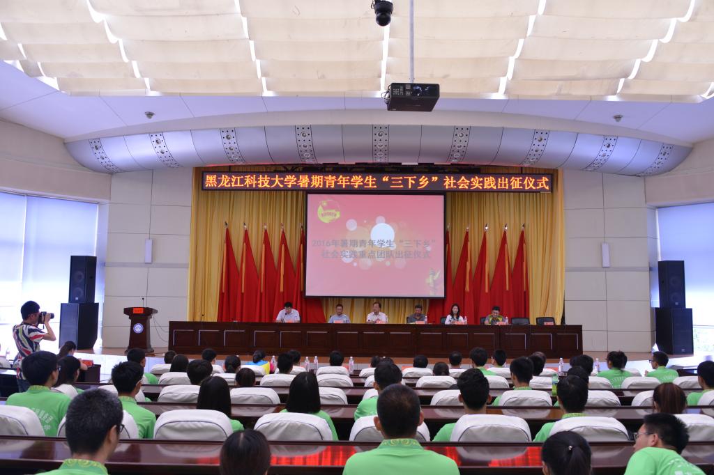 校团委副书记苗雨对2016年暑期青年学生“三下乡”社会实践团队基本情况进行了介绍并作以工作部署,与重点团队指导教师代表签订安全责任状。赴伊春爱心支教国家级社会实践服务团的队长工管14-1班王铭同学代表本次社会实践服务团的全体成员作了表态发言。与会领导向“三下乡”社会实践省级重点团队进行了授旗。