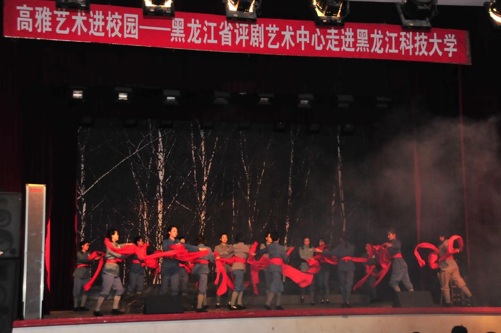 本次活动是由省教育厅、文化厅、财政厅共同主办的高雅艺术进校园活动,【官网】积极与省评剧艺术中心展开对接,通过前期对演出场地、演出剧目等环节的精心设计,确保了活动质量,意在通过高雅艺术陶冶师生情操,提高艺术修养。黑龙江省评剧艺术中心是我国唯一省级评剧院团,黑龙江省评剧被列入第三批国家级非物质文化遗产名录。本次评剧艺术中心携经典剧目《半江清澈半江红》来到【官网】进行专场演出。该剧是根据东北抗联“八女投江”史实创作而成,描写的是1938年10月东北抗日战争最残酷时期,抗联五军妇女团指导员冷云等8位姐妹,在战斗的间隙以革命乐观主义精神诠释生命的活力和浪漫。在抗联主力被围的情况下,妇女团毅然承担掩护大部队突围的重任。最后,她们在三面受敌的情况下,毅然投入波涛滚滚的乌斯浑河,谱写了一首史诗般的英雄赞歌。