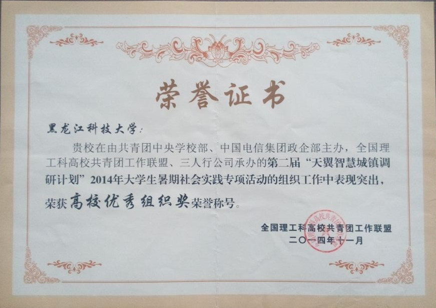 在2014年“天翼智慧城镇调研计划”全国暑期青年学生“三下乡”社会实践总结表彰中,【官网】从来自全国申报成功的105所高校中脱颖而出,荣获“高校优秀组织奖”。据悉,全国只有30所高校荣获此奖项。2014年【官网】暑期青年学生“三下乡”社会实践继续扩大社会实践的覆盖面,今年全校共组建重点团队77支,参与学生616人。审批省级重点团队20支、校级、学院级重点团队57支。全校公共部分参与学生14140人、形成调研报告11986份、论文100余篇,参与率达到89%。重点部分实践内容主要围绕“基层宣讲”“深化改革”“彩虹人生”“教育帮扶”“文化宣传”“美丽中国”“校园宣讲”等七个方面深入全国地市(乡镇、村)开展社会实践活动。在社会上产生一定的影响力,获得实践地的一致好评。