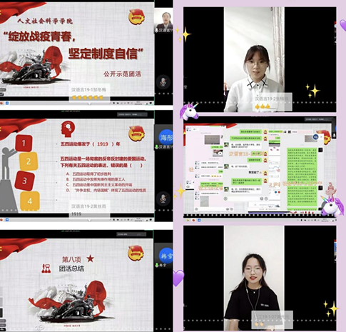 在五四运动101周年来临之际,为大力弘扬以爱国主义为核心的伟大民族精神和以“爱国、进步、民主、科学”为核心的五四精神,进一步坚定制度自信,引导广大青年学生在疫情防控期间紧密地团结在以习近平同志为核心的党中央周围,人文学院分团委于4月30日开展“绽放战疫青春,坚定制度自信”线上主题示范团活。校团委副书记张雪峰、人文社会科学学院党委书记陈连军、正处级辅导员王伟强,校团委、人文学院相关教师,2019级全体学生及各年级团干部参加了本次主题示范活动。