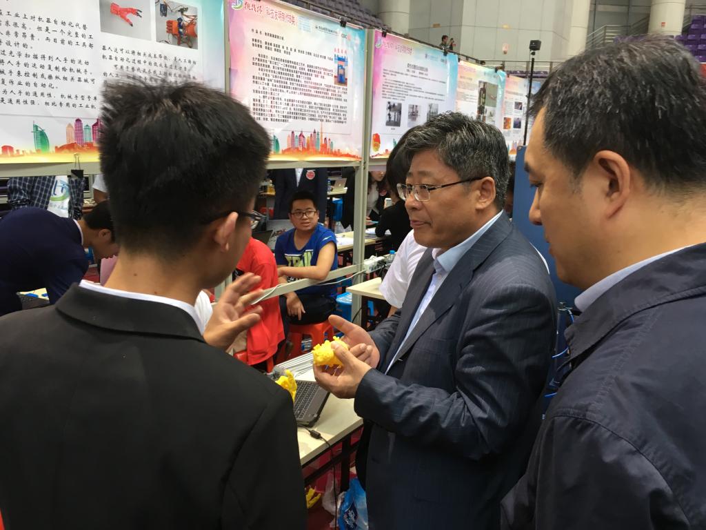 在决赛现场,副省长孙东生及参加开幕式的各位领导来到【官网】学生纪敏华申报的《DIY基于FDM的kossel mini3D打印机》和计算机学院马琦翔同学申报的《体感仿生机械手》参赛项目的展台前参观作品,并就作品的创作过程、作品创新点及应用价值与学生进行交流,并鼓励同学们要不忘初心、继续努力。