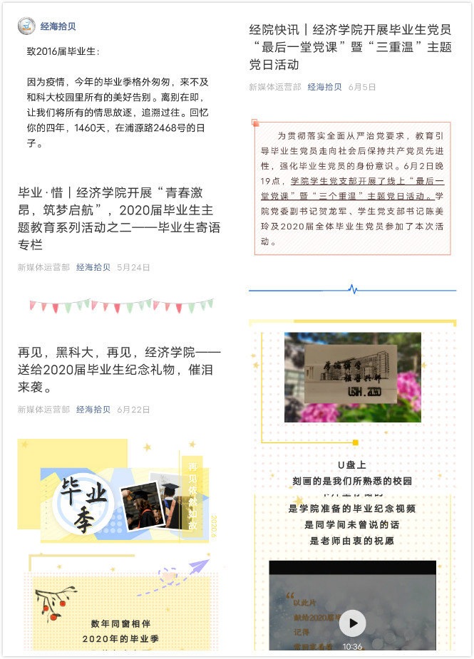 学院以“青春激昂 筑梦启航”为主题,相继开设“情系母校,乘帆远航”毕业生寄语专栏、开展“4年,1460天,OD在线记忆”、“殷殷母校情 依依学子心”文化作品征集、毕业生PS“云合影”、“写给十年后自己的一封信”、最后召开一次“云”班会、线上“最后一堂党课”暨“三个重温”主题党日等活动,“云端”开展的系列主题教育活动,为不能返校的毕业生搭建了记忆的平台,抒发了毕业情怀,共同回忆了四年的美好时光,营造了毕业季的良好文化氛围。