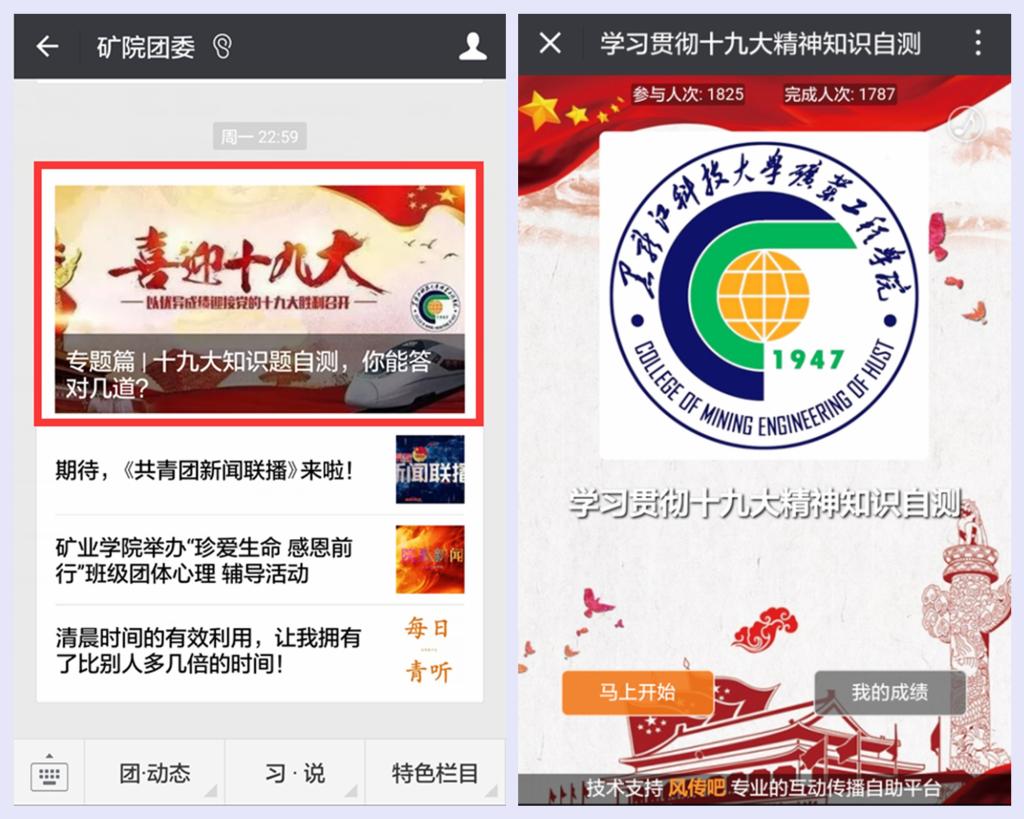 为认真学习贯彻党的十九大精神,在学院掀起全面学习贯彻落实党的十九大精神新高潮,真正做到学深悟透、学懂弄懂,切实用十九大精神武装头脑,指导实践。矿业学院在全院范围开展了“学习党的十九大精神”网络微答题活动。