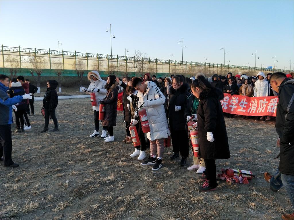 7点25分全体2018级学生和各年级学生代表在门球场空地集合,保卫处防火科科长徐长明对学生进行消防安全教育,讲解并现场演示灭火器的正确使用方法。随后,学生代表每人领取一个灭火器进行实际灭火操作,将点燃的干柴扑灭,演习结束。