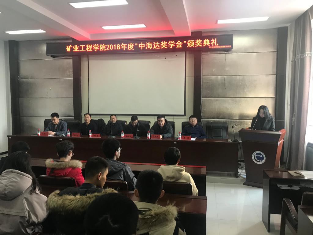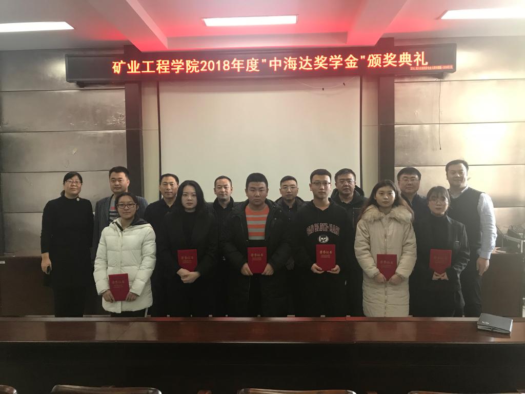 12月26日下午,矿业工程学院举办了2018年度“中海达奖学金”颁奖典礼。中海达卫星导航技术股份有限公司黑龙江分公司总经理胡海星,副总经理张智程,学院党委书记赵喜江,院长肖福坤,学院党委副书记高明星,副院长康健,测绘地理信息工程系主任窦世卿以及测绘专业师生代表参加了颁奖典礼。