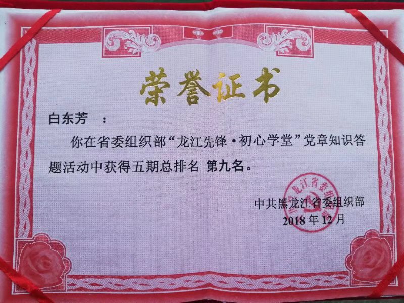 11月23日,省委组织部依托“龙江先锋”微信公众号开展的党章知识答题活动结束。【官网】区经济系16级2班学生、预备党员白东芳在全省参赛的74.25万人中脱颖而出,总成绩排名第9,最终获得黑龙江省“十佳选手”荣誉称号。