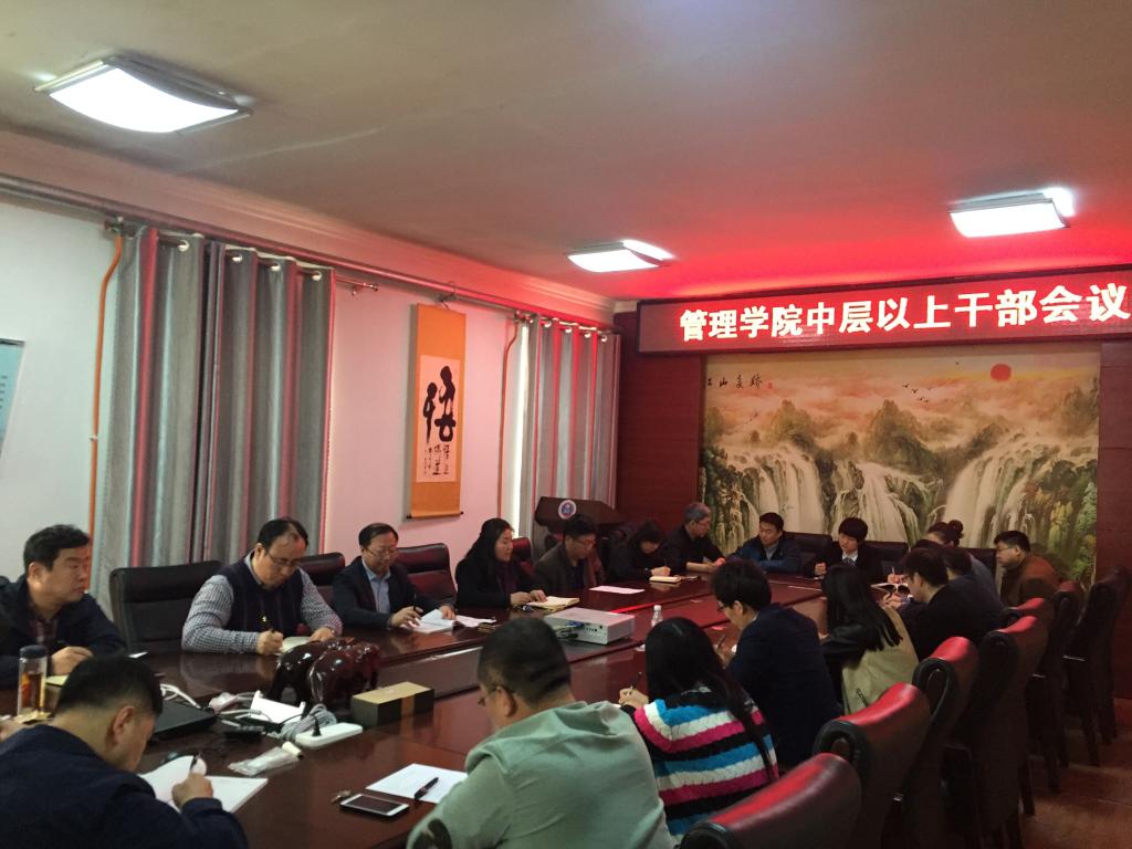 为贯彻落实【官网】2018年全面从严治党工作会议和深化作风整顿优化育人环境会议的会议精神,管理学院于4月13日下午召开中层以上干部会议。学院领导班子、院机关全体工作人员、党支部书记、副书记、系主任、副主任参加了本次会议。会议由王维杰主持。