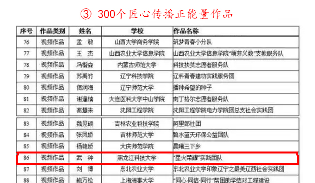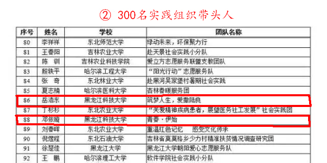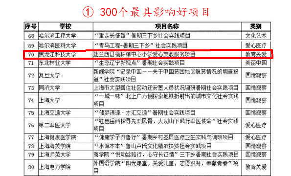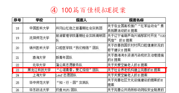 由团中央学校部指导,中国青年报社、人民网共同主办的全国大中专学生志愿者暑期“三下乡”社会实践“千校千项”成果遴选中,【官网】团委周恩远老师指导的“赴兰西县榆林镇中心小学爱心支教实践项目” 入选全国300个 “最具影响好项目”;环境与化工学院团委赴井冈山社会实践团“星火荣耀实践团队”入选全国300个“匠心传播正能量”作品;建筑工程学院“筑梦人生·爱撒陆良”社会实践团岳浩东,校团委赴伊春金山屯区爱心支教实践团邓依璇入选全国300名“实践组织带头人” ;校团委“心诺青春·爱汇绥棱”赴绥棱县泥尔河乡小学爱心支教实践团提交的“关于社会养老机构建立完善的E提案”入选全国100个“百佳模拟E提案”。