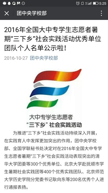 近日,由团中央学校部、全国学联秘书处表彰的2016年全国大中专学生志愿者暑期“三下乡”社会实践活动中【官网】环境与化工学院周惠玉老师指导赴井冈山全国青少年革命传统教育基地开展的“革命后代口述史料采集、整理及视频制作”社会实践团荣获全国“社会实践活动优秀团队”。