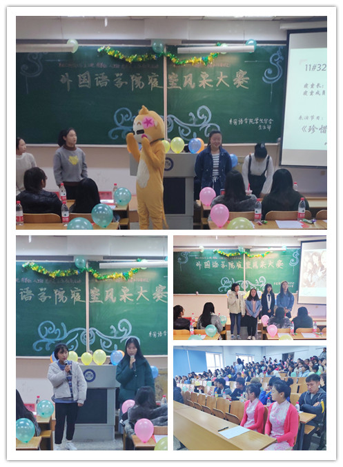 10月28日在科厦W209开展了寝室风采杯大赛。327寝室的手语表演《珍惜这段缘,小手牵一牵》,在小幸运的背景音乐下用沉默带给观众震撼,赢得全场掌声; 502寝室的歌曲集锦《Five O Two》由生动的舞蹈表演和动情的歌曲演唱组合,惊喜连连;326寝室的《Always Together》歌曲节奏欢快,点燃全场。本次活动的举办,丰富了同学们的课余文化生活,活跃了外国语学院寝室文化氛围,使外国语学院寝室风貌更加和谐友好。