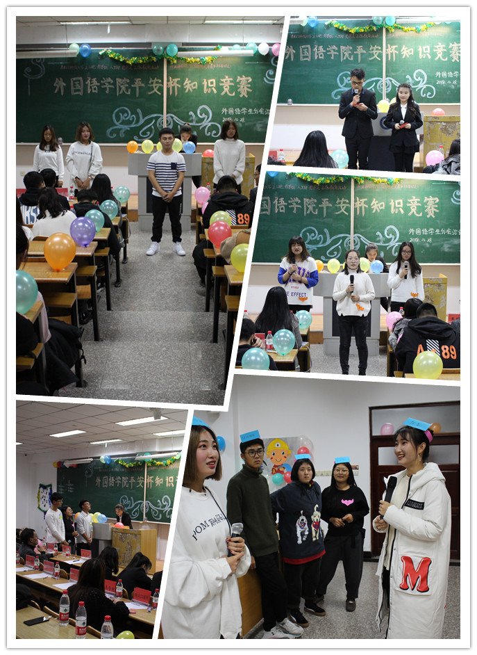10月28日在科厦W209举行了“平安杯”知识竞赛。第一环节,参赛的五组选手介绍自己的组合,喊出自己的口号并且进行才艺展示。最后冠军由英语18-1班富春婷,英语18-2班王馨彤和王秀丽组成的天线宝宝队摘得。本次活动提高了安全知识在同学们中的普及度,增强了同学们的安全意识。