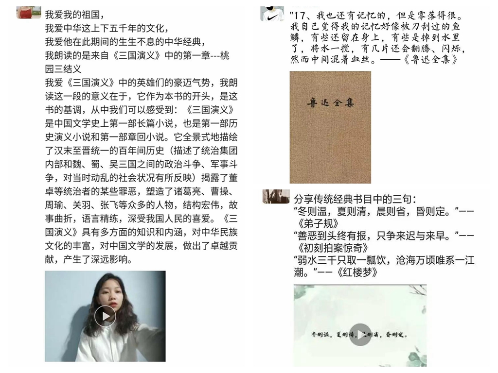 五、爱读书会分享,增强文化修养。为弘扬中华传统文化,增强青年大学生文化修养,坚定文化自信,引导学院广大青年养成“爱读书、爱分享;会读书、会分享”的好习惯,提高阅读能力,感受文字魅力,学风建设月期间开展以“‘疫’起‘悦’读”为主题的读书分享活动,号召同学们充分利用好课余时间,读一本好书、赏一篇美文、品一首好诗,同学们采取“线上+线下”的阅读模式,通过微信读书、喜马拉雅、樊登读书等App拓宽阅读渠道,进行了阅读和分享。