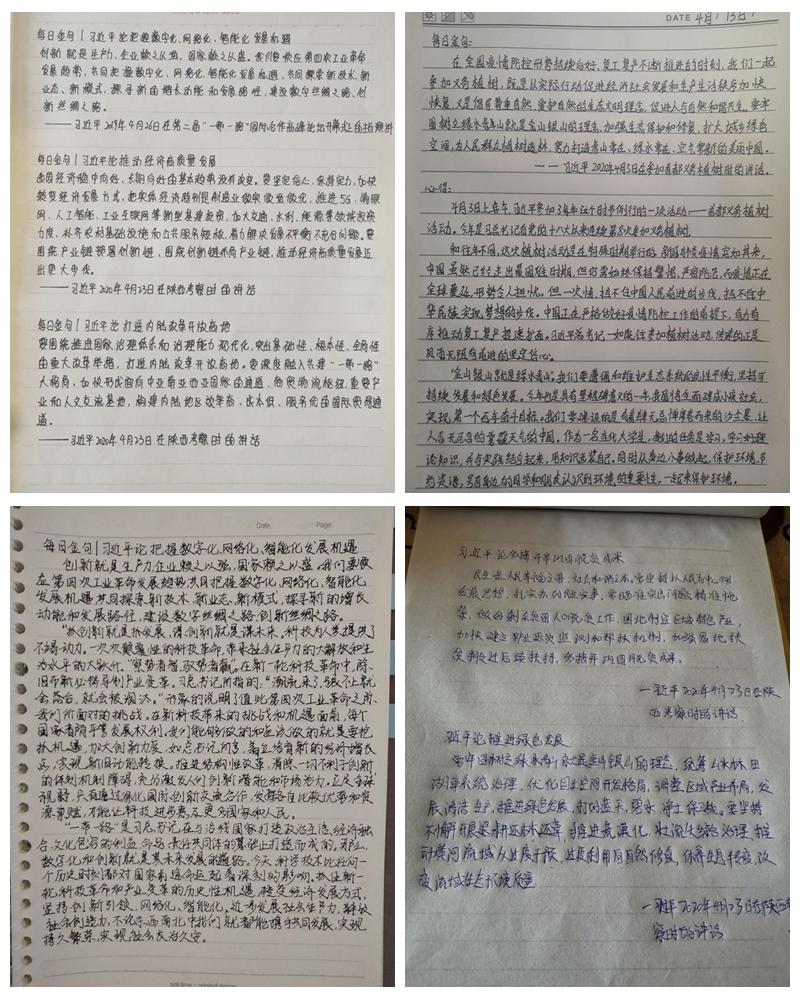 一、学金句诵语录,筑牢思想防线。积极向上的思想是培育优良学风的重要基础,结合当前线上学习安排,为了进一步把学生思想和行动统一到习近平总书记重要指示精神和党中央决策部署上来,引导学生注重学风建设,活动期间学生党员带头认真学习习近平总书记重要讲话精神,注重在线学习,充分发挥好“学习强国”APP作用,认真阅读、摘抄,坚持学习习近平“每日金句” ,并分享学习感悟。