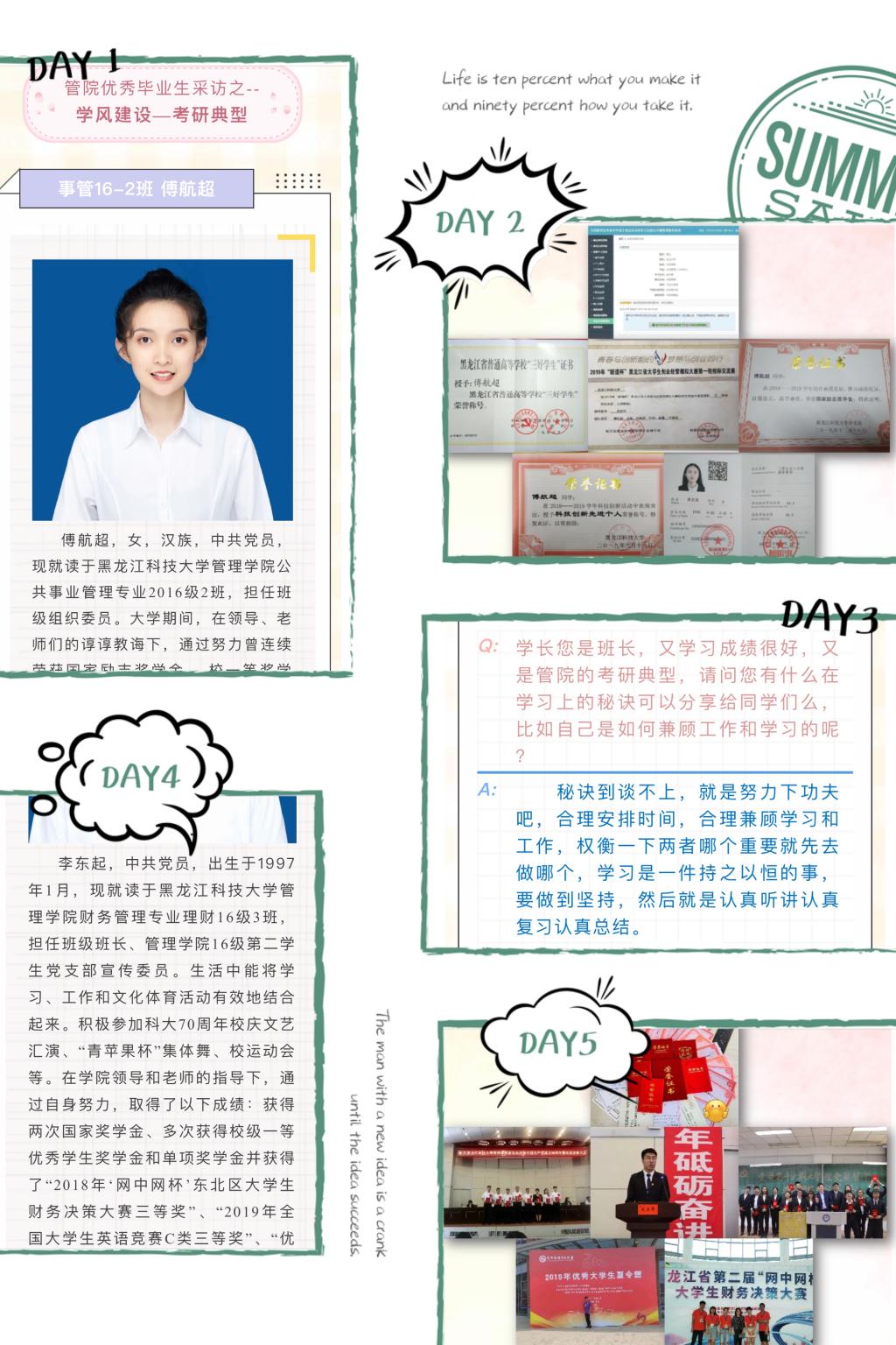 道别离,昔日情谊莫忘怀,望明朝,人生路上踏青云。此次活动将毕业生们的真挚情谊和宝贵经验永久珍藏,激励在校生明确方向、汲取经验,见贤思齐,更好的规划大学生活使得管院精神薪火相传、生生不息。同时也通过此次回忆采访让毕业生们再次回忆大学美好时光,感恩母校情,难忘管院恩,用青春的激情、执着的信念、过硬的本领,以梦为马、以汗为泉,不忘初心、不负韶华,志存高远、脚踏实地,在充满希望的明天,书写人生最为华美的诗篇!