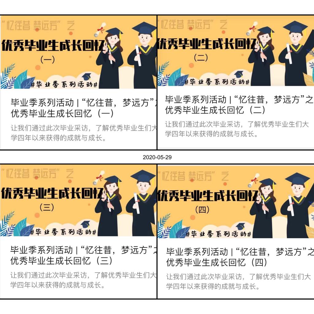 活动由学生分会海纳主持人团的小记者们通过微信,QQ等线上方式与学院多名优秀毕业生代表取得联络进行线上“云”采访。采访分为四个篇章分别选取了四个方面典型代表,分别为:学风建设——考研典型、脚踏实地——就业典型、勤勉尽责——学生干部典型以及无私奉献——志愿服务典型。优秀毕业生们从自己四年来的成长经历、收获感悟、学习方法、就业经验等方面向学弟学妹们提出了中肯的建议和鼓励。通过他们的经验分享,我们了解到每一份奋斗背后的付出和辛苦,感受到毕业生们对于学校的深厚感情和浓浓不舍同时也引导管院所有在校生向榜样看齐,向优秀致敬。