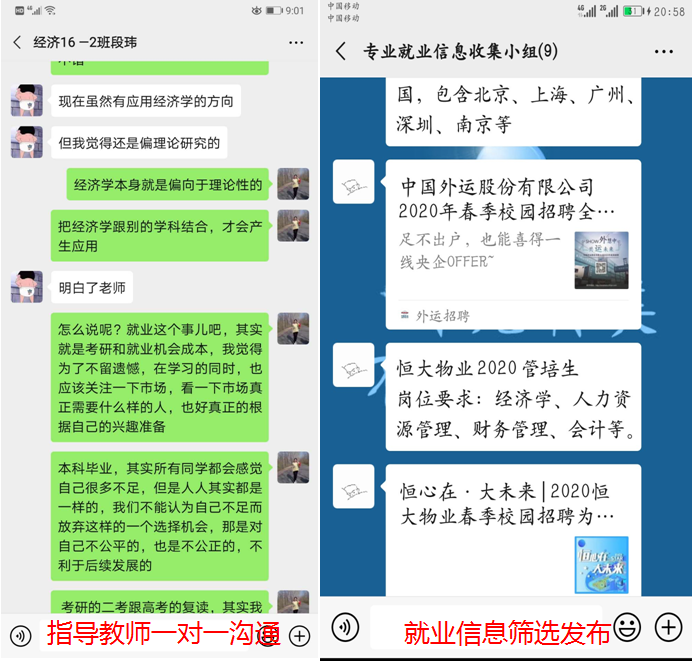 就业导师每周至少联系未就业学生1次,了解、指导和帮扶学生就业,并将学生就业情况及存在的问题反馈给学工办。同时,学院院号召每位教师要发挥自己的亲朋好友以及带过的毕业生等就业资源,收集就业信息,扩充就业信息渠道。