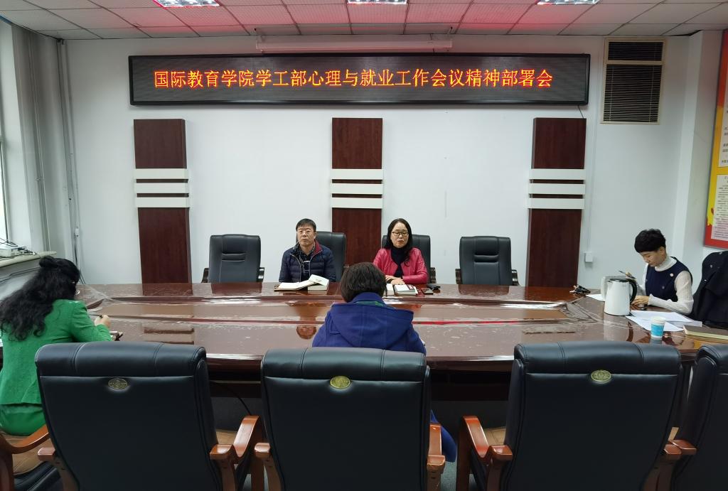 10月29日下午国际教育学院在学院会议室召开心理与就业工作推进会。学院全体教师参加,院长母丽华参加并讲话。会上,结合当前学生心理健康普查测试的结果及个别学生谈话访谈,围绕秋冬季节学生心理健康特点进行剖析,要求全体任课教师在加强课程思政的同时也要以生为本,加强对学生心理健康教育的关注,掌握学生心理问题的初期排查方法,形成全员育人的良好氛围。针对当前学校对就业工作的要求,学院结合实际,将毕业前的德育答辩指导任务前置,要求全体教师在指导学生德育的同时,要加强学生就业动员指导,使学生树立正确的择业、就业观,针对学生就业提出具体指导,进一步夯实就业任务,明确阶段目标责任,把就业工作完成质量作为教师年终考核的依据之一。