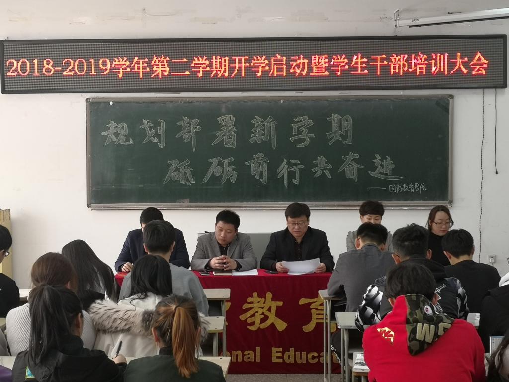 3月2日,国教学院开展了开学启动暨学生干部培训大会。会上,分团委书记徐强老师宣读了《青年志愿者服务活动月实施方案》及安排部署了近期团、学工作;辅导员田晨宣读了《国际教育学院2018-2019学年第二学期学生首周教育活动方案》;辅导员宋烨结合学风建设、优良学风班创建工作进行了安排部署;学工办主任徐海英对开学初学生日常基础工作及心理危机排查工作提出了具体要求;最后,党委书记邬承斌围绕学生干部提升政治理论素养、强化学风建设及基础文明建设做了重要讲话。(徐海英/文)