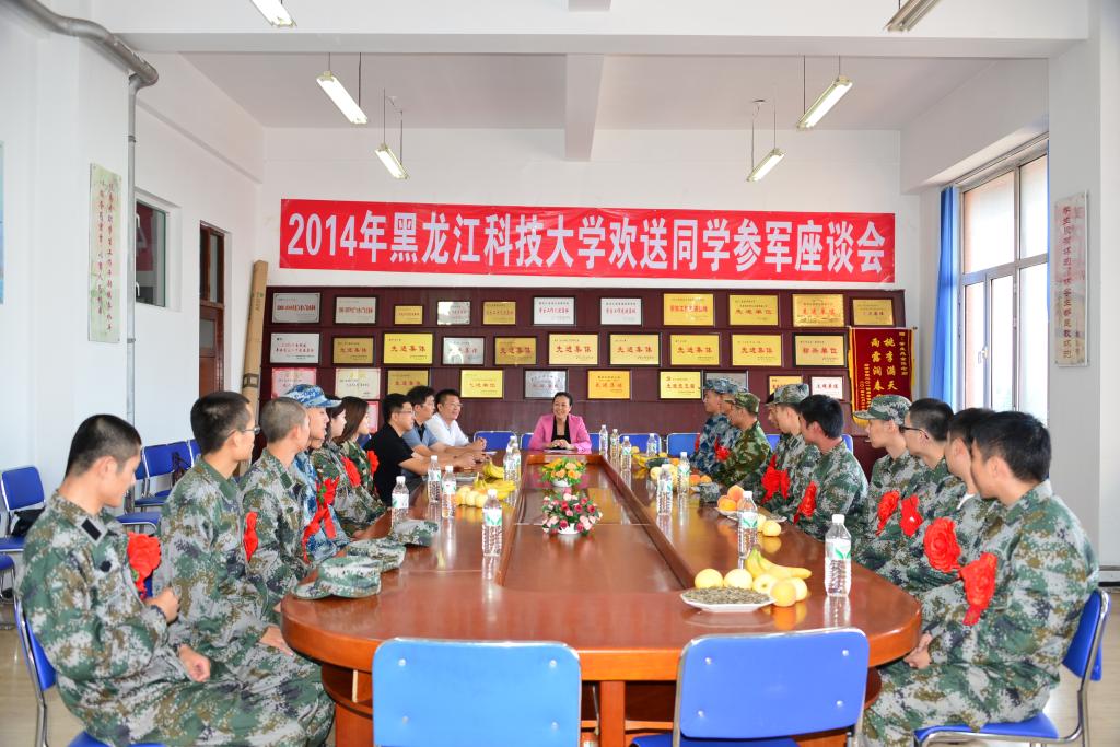 9月4日下午,【官网】在学生处会议室召开了2014年欢送参军入伍大学生座谈会。校党委常委、副校长陈桂芝,学工部(武装部)部长、学生处处长刘东江,学工部副部长、学生处副处长刘庆华,2014年参军入伍大学生代表参加了座谈会。