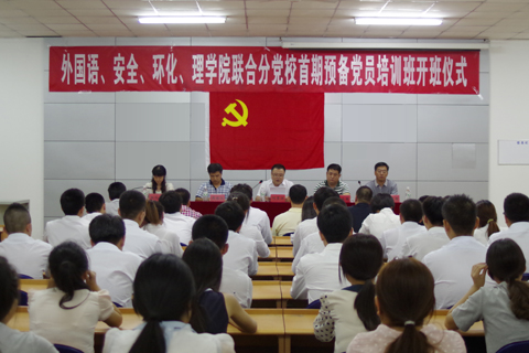 在全校上下深入实施内涵发展“八大工程”,全面推进应用型科技大学建设步伐,努力开创学校建设发展新业绩的重要时刻,为了发挥基层党组织战斗堡垒作用,通过有效加强预备党员继续培训教育,提高学生党员队伍的先进性和纯洁性,经过为期两个月的精心筹备,8月26日,外国语、安全工程学院、环境与化工学院、理学院联合分党校首期预备党员培训班开班仪式在安全学院会议室召开。校党委组织员办主任、组织部副部长、党校常务副校长何景洋、外国语学院党委书记唐立国、环化学院党委书记周国江、理学院党委书记王建国出席了开班仪式。会议由安全学院党委委员、学生党支部书记杨凤娟主持。四个学院的学生党支部书记、辅导员和预备党员参加了开班仪式。