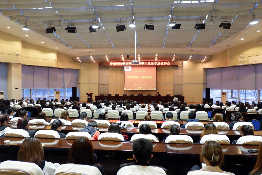 管理学院于4月12日,在信息报告大厅举办了党史学习教育宣讲会,学校党史学习教育理论宣讲团成员、管理学院党委书记何景洋、院党委副书记张晓光、各学生党支部书记和全体学生党员出席了会议。会议由张晓光主持。