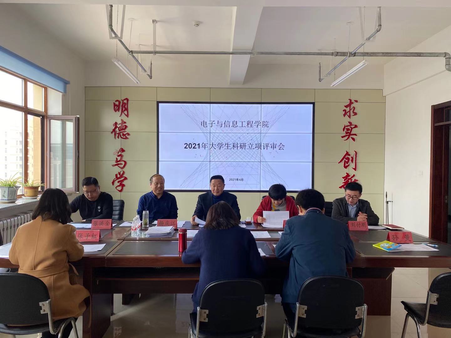 4月15日,电信学院在朝阳楼0809会议室召开了2021年大学生科研立项评审会,院党委书记贺启印、院党委副书记吕平、副院长杨庆江、相关专业教研室主任刘付刚、张洪全、王娟以及学院各协会指导教师陈义平、张子红、孙曼参加了本次评审会,会议由杨庆江主持。
