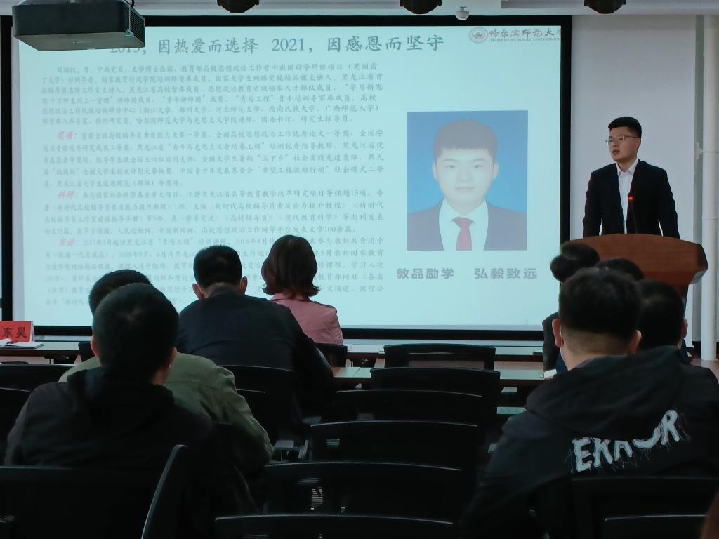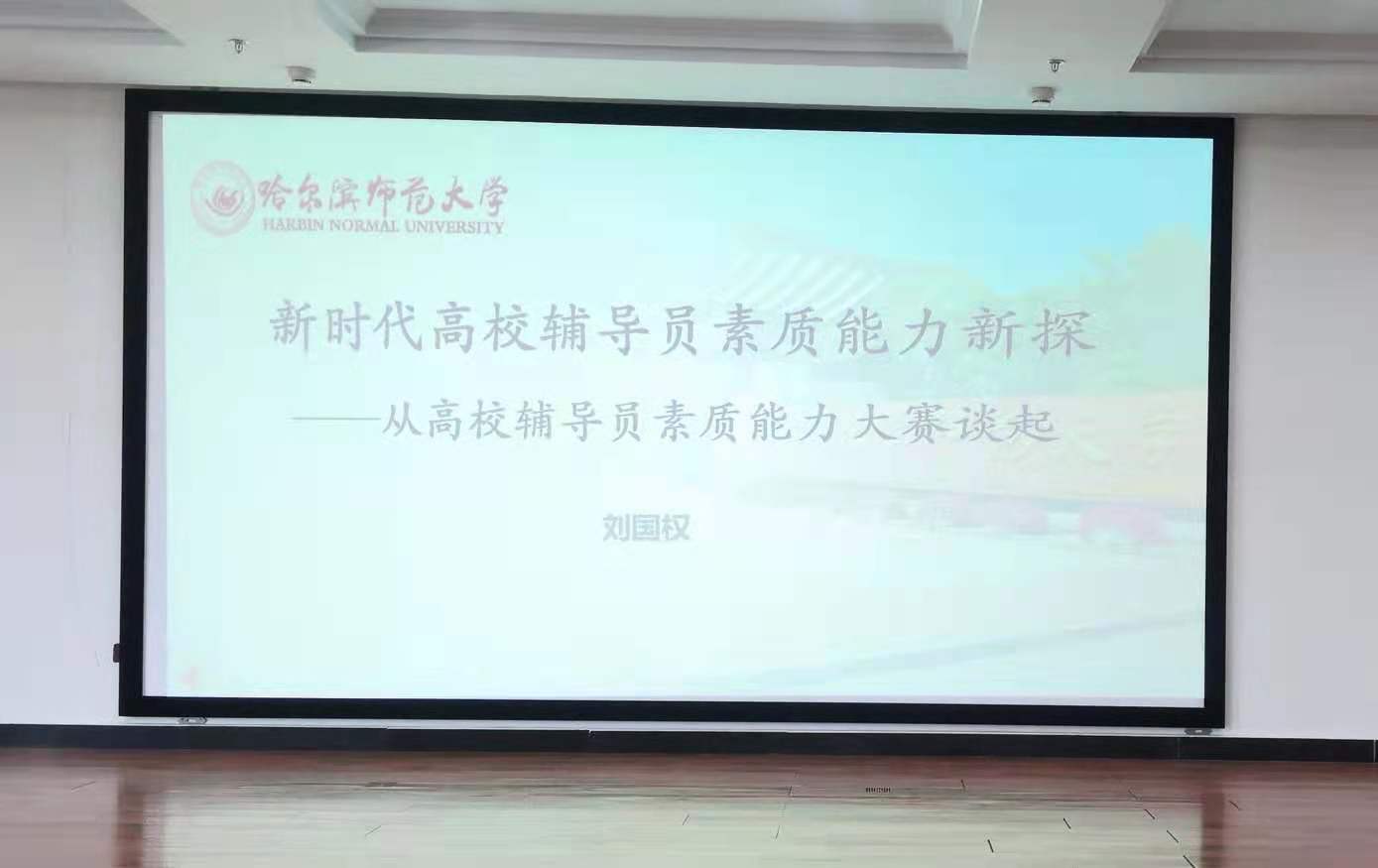 4月20日,【官网】专门邀请第七届全国高校辅导员素质能力大赛一等奖获得者、哈尔滨师范大学马克思主义学院辅导员刘国权,来【官网】开展“新时代高校辅导员素质能力新探”的专题培训,各学院主管学生工作副书记、全体辅导员参加了此次讲座。