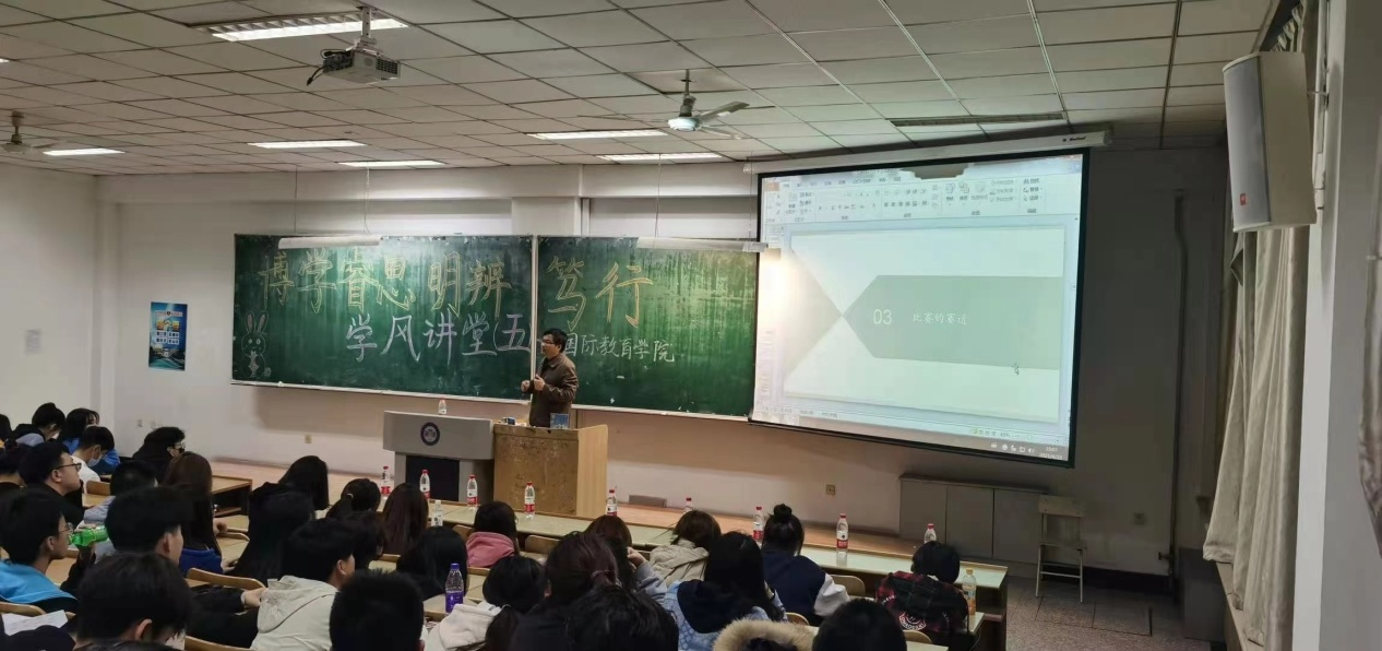 国际教育学院于4月29日开展了第五期“博学睿思,明辨笃行”学风讲堂,邀请OD在线创新创业中心副主任卢少春副教授到学院进行“互联网+”大学生双创大赛专题讲座,会议由院党委副书记徐海英主持。